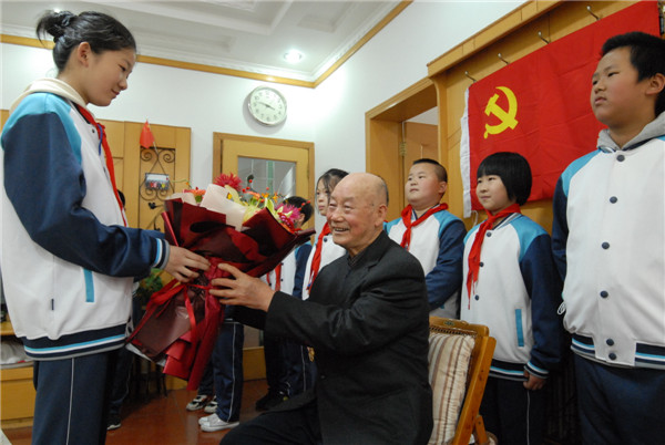 “我當兵的時候才13歲,那時候年紀小……”91歲的傅孝先現(xiàn)在說起那段戰(zhàn)火紛飛的崢嶸歲月,眼睛里依舊閃耀堅毅的光芒?!?月12日,山東省青島市即墨區(qū)環(huán)秀街道興家疃小學的孩子們帶著鮮花來到山東省青島市即墨區(qū)環(huán)秀街道磨市村91歲的老黨員傅孝先家中,聽老人講述當年的革命故事。讓孩子們從老黨員的故事中學黨史、感黨恩、跟黨走,推動黨史學習教育走心、走深、走實。