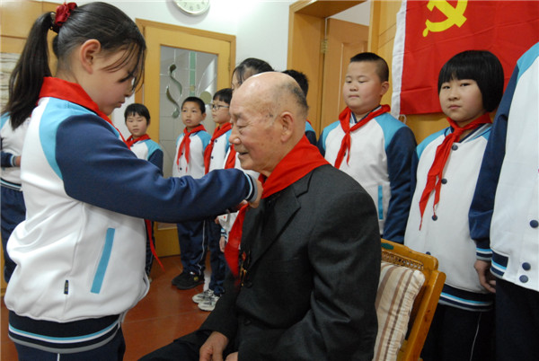在傅孝先老黨員家中,學生們給老黨員佩戴上鮮艷的紅領巾,整齊地敬上少先隊隊禮,用自己的方式表達了對老黨員的敬佩和愛戴之情。傅孝先老黨員為孩子們講述了自己在淮海戰(zhàn)役中馬肚皮藏身急送情報信動人心魄的紅色故事,說起戰(zhàn)斗故事,老人慷慨激昂,有聲有色,仿佛又回到了那個年代,讓孩子們感受一次愛國主義教育。