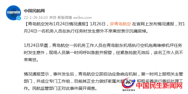 【青島航空發(fā)布1月24日情況通報(bào)】1月26日,@青島航空 在官網(wǎng)上發(fā)布情況通報(bào),對(duì)1月24日一名機(jī)務(wù)人員在執(zhí)行任務(wù)時(shí)發(fā)生意外不幸離世表示沉痛哀悼。