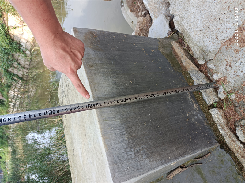 調查員在事發(fā)現(xiàn)場注意到,該橋梁兩側并沒有設計單位及施工單位標識,橋梁高度明顯低于兩岸,橋梁設計的泄洪口由兩根預制水泥管代替,非常容易堵塞。橋面一側設計有防護墩,而另一側卻不知去向。調查員仔細觀察發(fā)現(xiàn),防護墩設立非常脆弱,鏈接防護墩的水泥標號明顯不符合標準,呈“豆腐渣”狀。