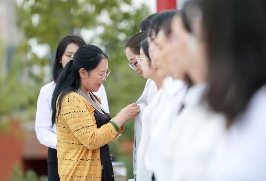隨后,校黨委副書記、執(zhí)行校長徐愛民,組織部部長黃巖及青島第五屆高校教學名師獲得者莊新穎、單菁華為新進教師佩戴校徽。