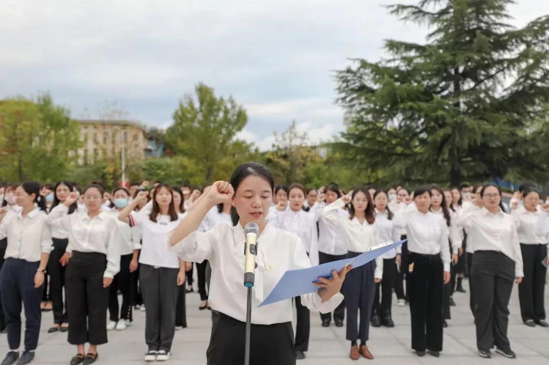 學校優(yōu)秀教師代表,馬克思主義學院教師劉鎖霞領誓。全體新入職教師舉起右手面對國旗和校旗莊嚴宣誓,志愿做一名光榮的人民教師,對黨和人民的教育事業(yè)進行了莊嚴承諾。