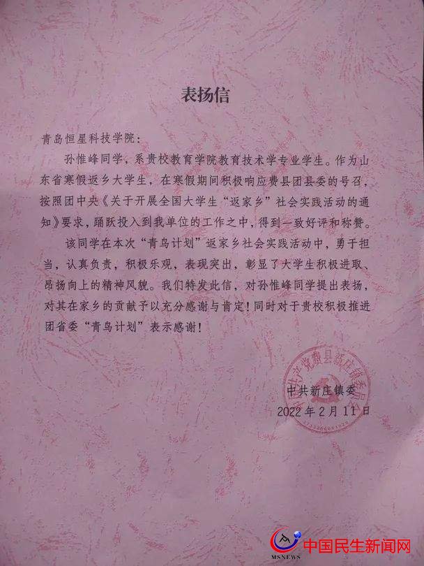 教育學(xué)院19級孫惟峰同學(xué)在寒假期間積極響應(yīng)國家疫情防控的號召,中共新莊鎮(zhèn)委來信表達(dá)對他工作踏實(shí)肯干、認(rèn)真負(fù)責(zé)的認(rèn)可。