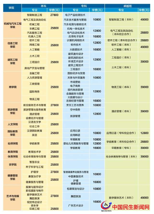 學(xué)校設(shè)有商學(xué)院、建筑工程學(xué)院、健康管理學(xué)院、國際教育學(xué)院、機(jī)械與汽車工程學(xué)院、信息工程學(xué)院、藝術(shù)與傳媒學(xué)院、幼師學(xué)院、旅游管理學(xué)院、農(nóng)學(xué)院、人文學(xué)院、教育學(xué)院、體育學(xué)院、馬克思主義學(xué)院等14個(gè)二級學(xué)院。現(xiàn)開設(shè)本科專業(yè)40個(gè),高職??茖I(yè)37個(gè),涵蓋工學(xué)、管理學(xué)、藝術(shù)學(xué)等9個(gè)學(xué)科門類,形成了以工學(xué)、管理學(xué)為主,多學(xué)科協(xié)調(diào)發(fā)展的學(xué)科專業(yè)布局。目前學(xué)校建有2個(gè)省級一流本科專業(yè),4個(gè)省民辦本科高校優(yōu)勢特色專業(yè)。2021年學(xué)校入選山東省第二批應(yīng)用型本科高校建設(shè)單位。