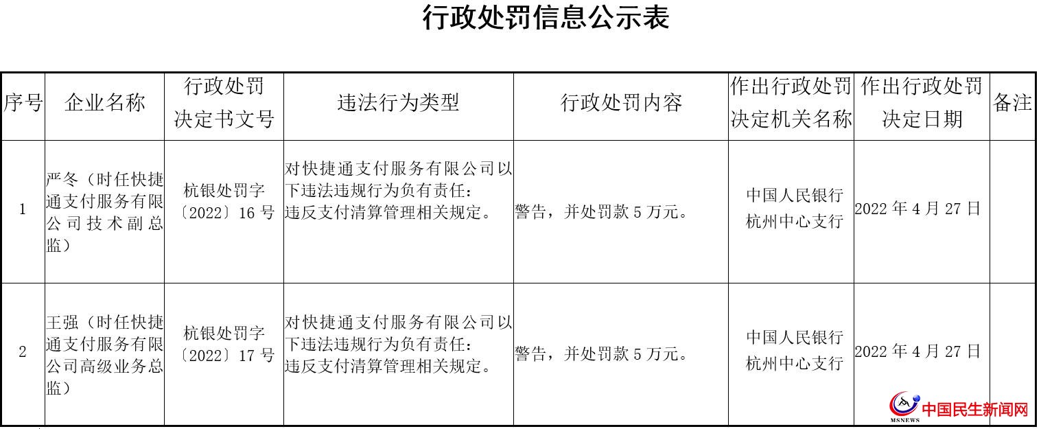 金融虎網(wǎng)注意到,5月10日,快捷通支付兩名管理人員嚴(yán)冬和王強(qiáng)均因?qū)?ldquo;違反支付清算管理相關(guān)規(guī)定”負(fù)有責(zé)任,分別被給予警告,并各處罰款5萬(wàn)元。嚴(yán)冬時(shí)任快捷通支付服務(wù)有限公司技術(shù)副總監(jiān),王強(qiáng)時(shí)任快捷通支付服務(wù)有限公司高級(jí)業(yè)務(wù)總監(jiān)。