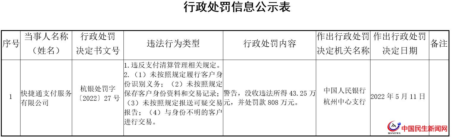 金融虎訊 5月23日消息,近日,央行杭州中心支行公布的行政處罰信息公示表顯示,快捷通支付服務(wù)有限公司因違反兩項(xiàng)規(guī)定被給予警告,沒(méi)收違法所得43.25萬(wàn)元,并處罰款808萬(wàn)元。