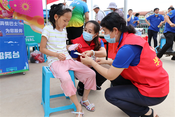 7月16日,一位來自山西的小女孩在啤酒城城內(nèi)游玩時(shí),不慎將腳踝碰到了巖石上,擦出了血,家長正愁沒法消毒處理傷口。“我們有應(yīng)急藥箱,我們來給你處理!”“老兵情”團(tuán)隊(duì)的志愿者邢海英連忙扶女孩坐下,拿出服務(wù)驛站提前準(zhǔn)備好的應(yīng)急藥箱,用碘伏給小女孩的傷口消了毒,并進(jìn)行簡單處置。小女孩家人非常感激,直對師傅們說“青島風(fēng)景好,服務(wù)超熱情,以后孩子放假一定再來!”