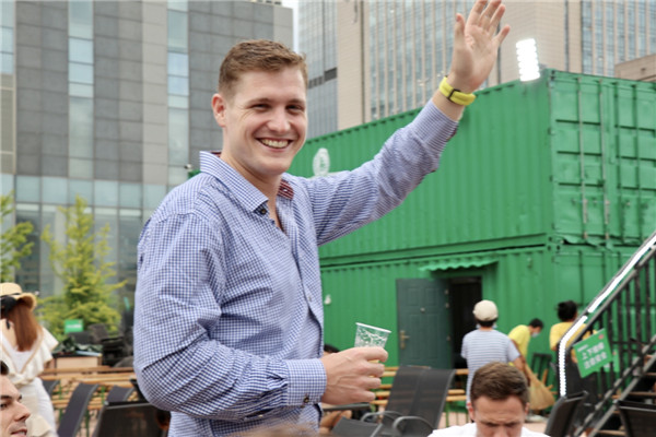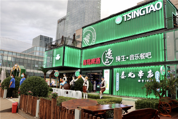 花園負責人張相田介紹,今年他們在環(huán)境打造上極力貼合百年國潮的主題風格,以國潮風+復古風為主進行設計,“我們在一樓的室內(nèi)空間里用3000余個廢舊的啤酒瓶打造了一整面背景墻,在二樓,墻面上的老窗戶都是我們從浙江搜集過來的,都是從六七十年代的老建筑上拆下來,在室外,我們用青啤的文化元素打造了一處文化墻。”