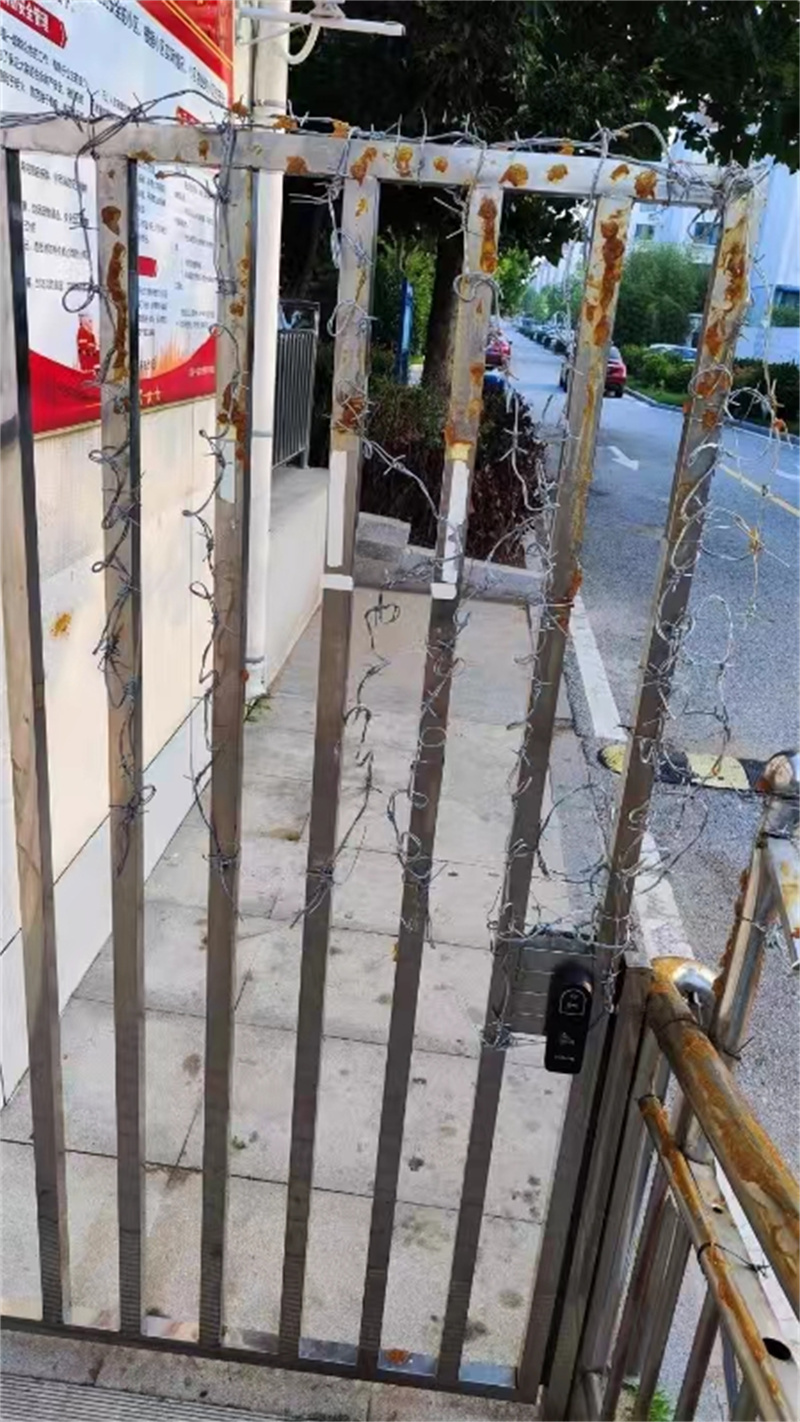 就此事,調(diào)查員打通了該小區(qū)物業(yè)電話,一位姓葛的女士告訴調(diào)查員,她們小區(qū)南門的自動出入系統(tǒng)已經(jīng)壞了兩個月了,配件還沒到,所以就一直沒有開放。至于抹上大黃油和綁鐵絲,是為了防止業(yè)主隨意攀爬。