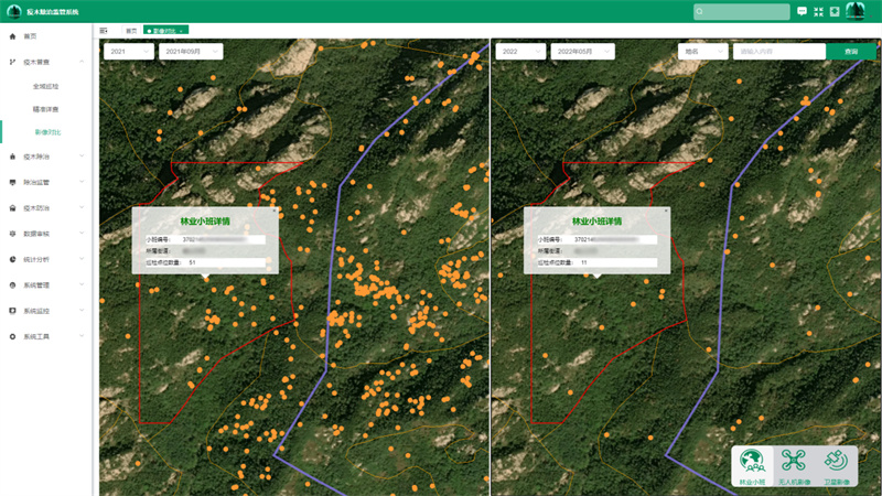 “空天地”一體化的創(chuàng)新監(jiān)測(cè)模式使松材線蟲(chóng)病的普查區(qū)域全面性、預(yù)警時(shí)效性、監(jiān)測(cè)準(zhǔn)確性和除治科學(xué)性大大增強(qiáng),減少了所需人力物力的投入,并且可以將松材線蟲(chóng)病的監(jiān)測(cè)預(yù)警精確到株,在衛(wèi)星影像上進(jìn)行空間化展示和標(biāo)記,對(duì)“病枯死松樹(shù)數(shù)量”“病枯死松樹(shù)位置”“除治進(jìn)度”“成效核查”等指標(biāo)進(jìn)行科學(xué)化監(jiān)測(cè)、精細(xì)化管理和智能化分析,有利于管理部門(mén)宏觀快速地了解各個(gè)疫點(diǎn)疫情發(fā)生態(tài)勢(shì)和危害程度,進(jìn)一步提高了松材線蟲(chóng)病防控工作和疫情評(píng)估的科學(xué)性,為松材線蟲(chóng)病防治提供準(zhǔn)確的數(shù)據(jù)依據(jù)。