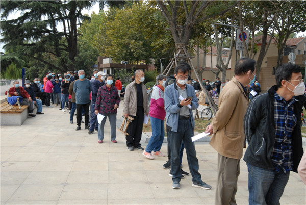 10月13日上午9點(diǎn)半,山東青島市即墨區(qū)墨河公園核酸檢測(cè)點(diǎn),五百多名來(lái)自青島即墨區(qū)通濟(jì)街道府前街居委會(huì)的居民戴著口罩、間隔1米,有序等候采集咽拭子。