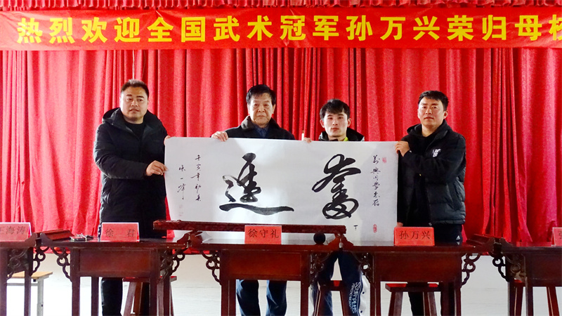 學(xué)校董事長徐守禮先生親自向?qū)O萬興同學(xué)贈送他的墨寶“奮進”,還贈送了徐學(xué)義武學(xué)研究院定制珍藏版龍泉寶劍并致辭,號召育才武校學(xué)子向他們的學(xué)長孫萬興同學(xué)學(xué)習(xí),志存高遠(yuǎn),刻苦練功,奮進拼搏,為國爭光!