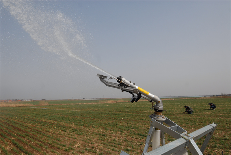 在大信街道普東村農民袁術先的農田里,種糧大戶袁術先正在利用雙翼式平移自行噴灌機給小麥澆水,通過提前設定好流量和時間便可實現全方位、無死角灌溉。袁術先告訴記者,眼下,最關鍵的就是根據小麥苗情長勢加強水肥管理,提高小麥分蘗成穗率,搭好豐產架子。