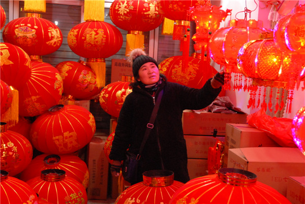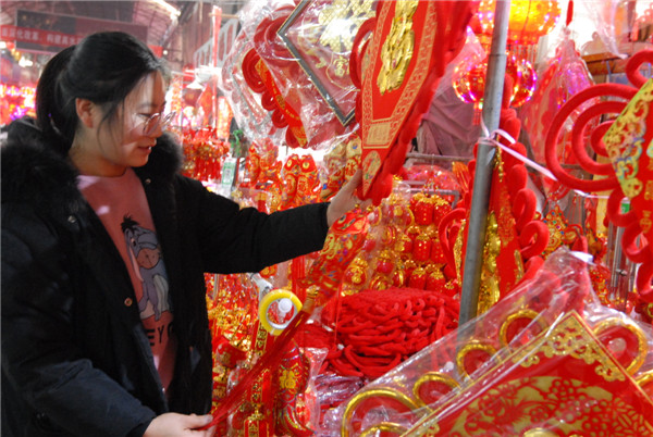 1月15日,顧客在山東青島市即墨區(qū)小商品城選購新年飾品。 隨著新春佳節(jié)的臨近,山東青島市即墨區(qū)小商品城的年貨市場日漸紅火,攤位上喜氣洋洋,店鋪擺滿了燈籠、福字、金牛等新年飾品,紅燈籠、中國結(jié)、電子鞭炮、對聯(lián)、掛件等新年飾品和琳瑯滿目的商品吸引著眾多的顧客。即墨區(qū)小商品城迎來喜慶用品節(jié)前銷售旺季。