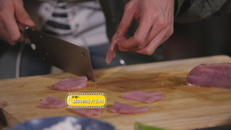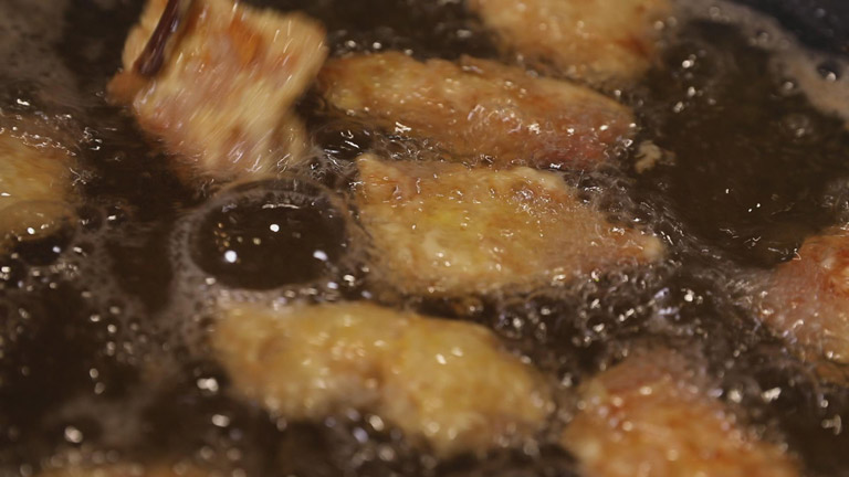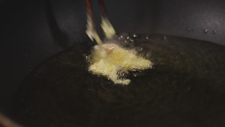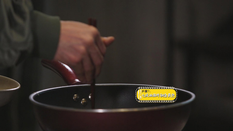 5.腌好的肉片裹上淀粉后再沾上蛋液。一片一片的下入七成熱的油鍋中。