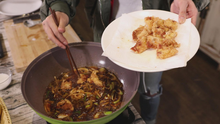 9.下入炸好的酥肉,淀粉勾芡之后,翻炒片刻將湯汁收干即可