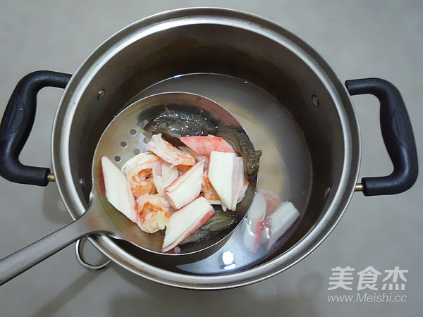 8.海參、蟹肉棒、蝦仁放入沸水中炒熟撈出。