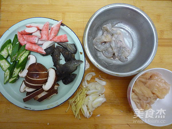 1.主要食材:嫩豆腐、鮮蝦仁、雞肉、香菇、蟹肉棒、海參、秋葵