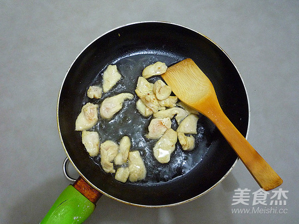 7.利用煎炸豆腐的余油把腌漬好的雞片滑炒至變色撈出。