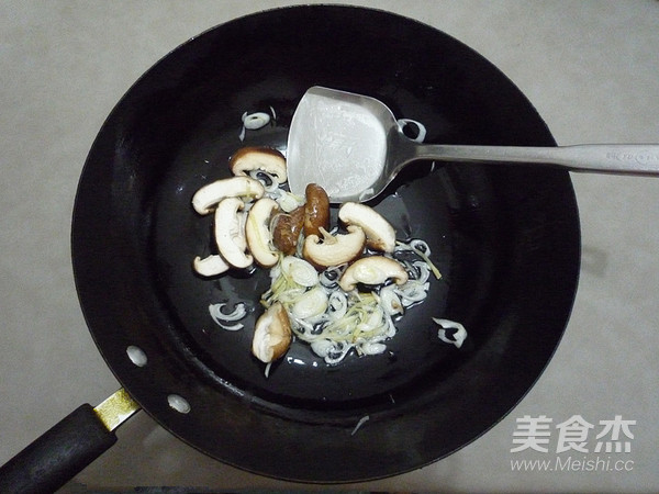 9.熱鍋涼油,放入蔥姜爆香后放入香菇炒出香味。