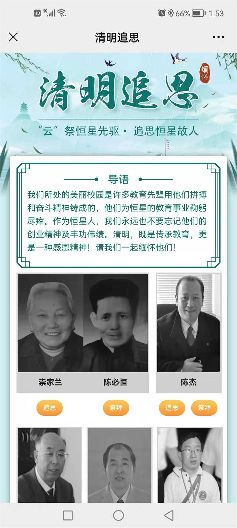 青島恒星科技學(xué)院建校二十余年,在這期間,有十幾位先驅(qū),為了恒星的發(fā)展,他們爭(zhēng)分奪秒、努力奉獻(xiàn),為恒星的發(fā)展壯大奉獻(xiàn)出了畢生的精力和智慧。為了能充分表達(dá)恒星人的對(duì)他們的追思,恒星學(xué)院還開設(shè)了專題“云祭恒星先驅(qū) 追思恒星故人”進(jìn)行“云祭奠”活動(dòng)。此活動(dòng)得到廣大師生的響應(yīng),他們紛紛進(jìn)入專題,對(duì)先驅(qū)們進(jìn)行網(wǎng)上追思和“獻(xiàn)花”活動(dòng)。恒星學(xué)院師范專業(yè)的張同學(xué)認(rèn)為,他們所處的美麗校園是教育先輩用他們的拼搏和奮斗精神鑄成的,作為恒星學(xué)子,一定不會(huì)忘記他們的豐功佳績(jī)。如果沒有他們,也許自己就不能在這里安靜地上課和學(xué)習(xí),即使畢業(yè)了,也要將他們的同心同德、自信自強(qiáng)的精神傳承下去。(素素)