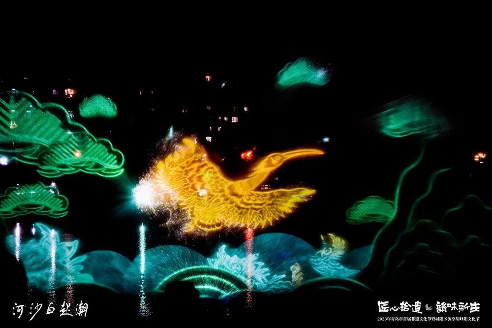 尤其顛覆想象的是,在非遺水陸光影秀《潮起白沙河》中,“非遺+藝術(shù)+科技”的組合模式,令人耳目一新,流連忘返——朱鹮、白鷺、文鰩魚、山、海、云、傳統(tǒng)書法等元素通過水幕光影的形式,為大眾營造出超酷炫的夢幻空間。
