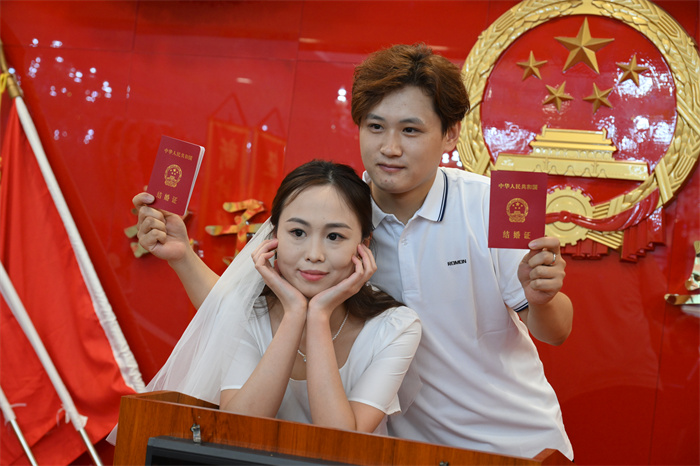 為了讓領(lǐng)證這一天更具意義,許多女士還特意穿上了白色連衣裙,手捧鮮花、頭戴白紗,臉上滿是對(duì)未來美好生活的向往。新人們高高興興而來,喜滋滋而歸!