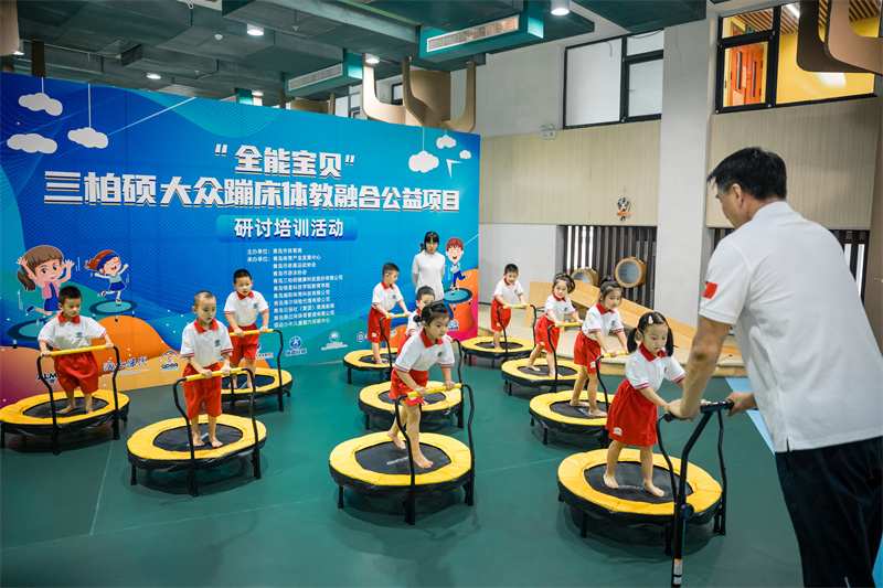 教育學(xué)院將聯(lián)合三柏碩進(jìn)行深入的產(chǎn)教融合課題研究,優(yōu)化幼兒教師的培養(yǎng)。教育學(xué)院現(xiàn)有校外實(shí)訓(xùn)基地400多家,包括青島市湖北路幼兒園、青島市城陽(yáng)區(qū)阡陌墅幼兒園、城陽(yáng)區(qū)夏莊鎮(zhèn)拉菲莊園童之夢(mèng)幼兒園、即墨區(qū)環(huán)秀聰慧寶貝幼兒園、膠西鎮(zhèn)百盛尚美幼兒園等多家省級(jí)示范幼兒園,已培訓(xùn)幼兒體適能教師300余人,培養(yǎng)學(xué)前教育學(xué)生3000余人。利用現(xiàn)有的資源優(yōu)勢(shì),教育學(xué)院將與三柏碩和青島市體操協(xié)會(huì)共同選取青島區(qū)域內(nèi)100所試點(diǎn)學(xué)校進(jìn)行蹦床運(yùn)動(dòng)的普及推廣。從安全性、科學(xué)性、客觀性、趣味性入手,研發(fā)出一套適合3—6歲幼兒身心發(fā)展特點(diǎn)的課程體系和指標(biāo)評(píng)價(jià)體系,制定市級(jí)幼兒體育規(guī)范課程,打造“蹦床文化+教育+競(jìng)賽+展演+體驗(yàn)+N”的體教融合模式,以及產(chǎn)、學(xué)、研、用、創(chuàng)一體化的“產(chǎn)教融合”新理念。