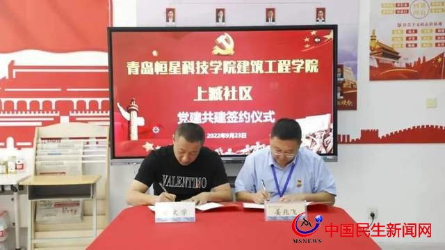 9月23日上午,為深化黨建工作內(nèi)涵,積極推動(dòng)學(xué)校與社區(qū)互聯(lián)互動(dòng)、共建共享工作,恒星學(xué)院之建筑工程學(xué)院與上臧社區(qū)在A4近思樓510黨團(tuán)活動(dòng)室隆重舉行黨建共建簽約儀式。參加簽約儀式的有上臧社區(qū)黨委書記陳文學(xué)、副書記臧傳云、居委會(huì)副主任臧忠波、委員高丹丹、委員臧傳鵬、工作人員戴明,青島恒星科技學(xué)院建筑工程學(xué)院黨總支書記、執(zhí)行院長(zhǎng)姜兆飛,院長(zhǎng)劉健、黨總支副書記崇加浩、組織委員焦欣欣、紀(jì)檢委員王萍、宣傳委員李倩如、學(xué)生黨支部組織委員張瑞莉雪、宣傳委員梁志強(qiáng)。