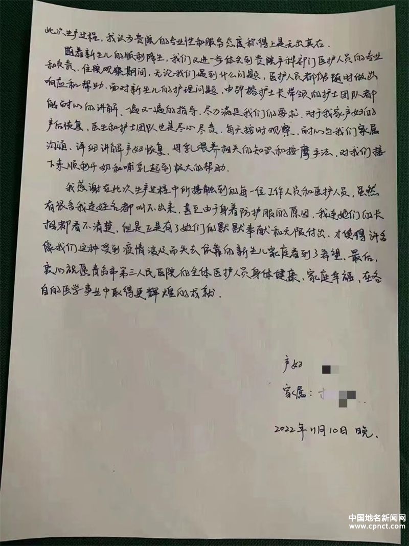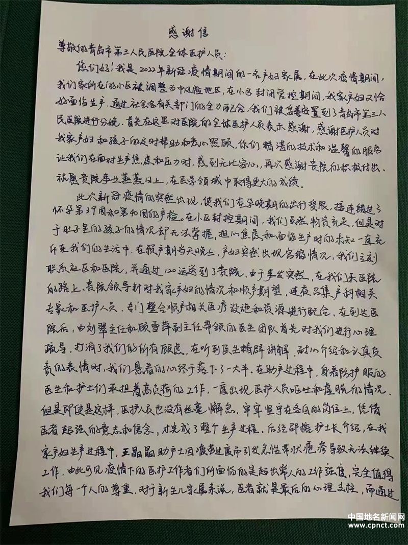 在11月初疫情突發(fā)期間,被封控小區(qū)的市北居民楊先生面對愛人即將臨產的情況向興隆路街道海岸路社區(qū)求助,在市北區(qū)疫情防控指揮部醫(yī)療救治組等有關部門的全力配合下,楊先生的愛人被妥善安置到青島市第三人民醫(yī)院,順利分娩。近日,楊先生向醫(yī)院送來他于11月10日晚寫下的一封感謝信。