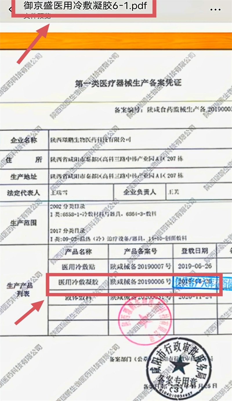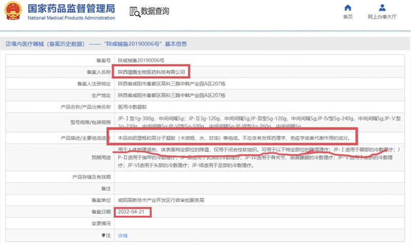 由代理提供的產(chǎn)品備案信息可看到,“御京盛·醫(yī)用冷敷凝膠”的產(chǎn)品備案號(hào)為:陜咸械備20190006號(hào)。在國(guó)家藥品監(jiān)督管理局官網(wǎng)查詢(xún)?cè)搨浒柑?hào)得到的信息是,該產(chǎn)品的備案人是陜西璟鵬生物醫(yī)藥科技有限公司,備案日期是2022年4月21日,也就是說(shuō),該產(chǎn)品是陜西璟鵬生物醫(yī)藥科技有限公司代加工生產(chǎn)的。并且,該產(chǎn)品屬于第一類(lèi)醫(yī)療器械,由鋁塑瓶和高分子凝膠(卡波姆、水、甘油)等組成,不應(yīng)含有發(fā)揮藥理學(xué)、免疫學(xué)或者代謝作用的成分。用于人體物理退熱、體表面特定部位的降溫,僅用于閉合性軟組織,適用于眼部的冷敷理療。由此可見(jiàn),“御京盛·醫(yī)用冷敷凝膠”并不具備其所宣傳的治療各種眼疾、近視的效果,其有關(guān)宣傳材料明顯存在醫(yī)療器械廣告宣傳的功能主治、適用范圍超出了批準(zhǔn)的內(nèi)容,含有不科學(xué)地表示功效的斷言和保證,嚴(yán)重欺騙和誤導(dǎo)消費(fèi)者。