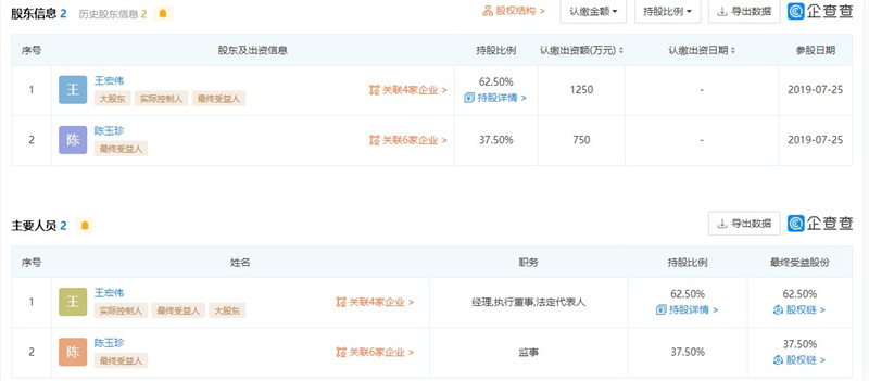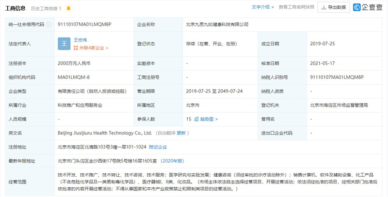 北京九思九如健康科技有限公司成立于2019年7月25日,注冊(cè)地位于北京市海淀區(qū)北清路103號(hào)3幢一層,注冊(cè)資本為2000萬(wàn)元,法定代表人為王某偉。該公司由王某偉控股62.5%并擔(dān)任執(zhí)行董事兼總經(jīng)理,陳某珍持股37.5%并擔(dān)任監(jiān)事。王某偉是該公司的實(shí)際控制人盒最終受益人。
