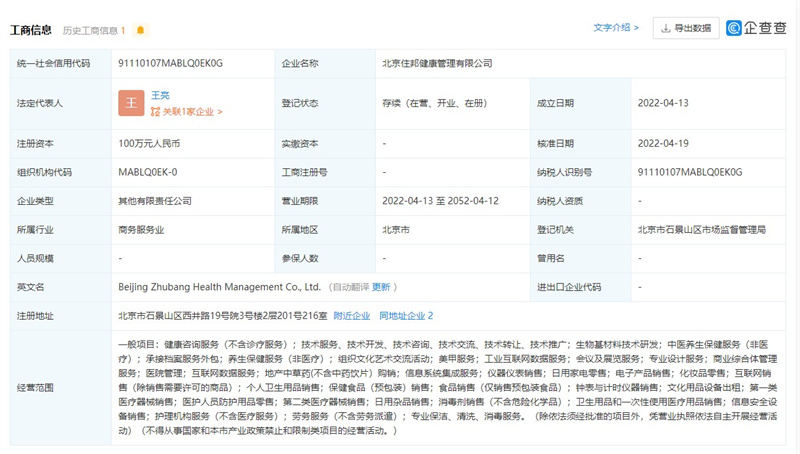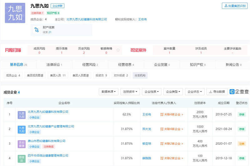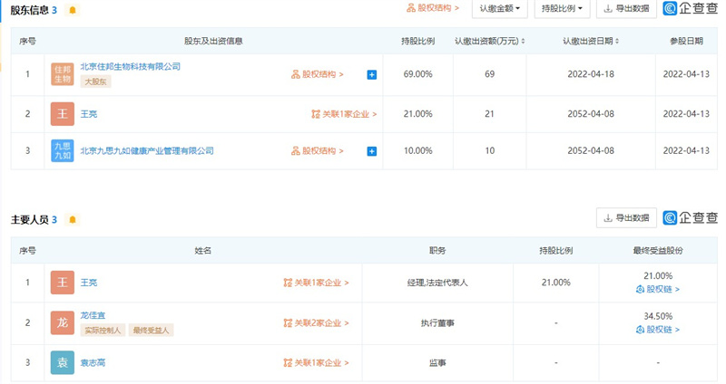 企查查APP顯示,北京住邦健康管理有限公司成立于2022年4月13日,注冊(cè)地位于北京市石景山區(qū)西井路19號(hào)院3號(hào)樓,注冊(cè)資本為100萬(wàn)元,法定代表人為王某。王某擔(dān)任該公司總經(jīng)理,龍某宜擔(dān)任執(zhí)行董事,袁某高擔(dān)任監(jiān)事。該公司由北京住邦生物科技有限公司控股69%,北京九思九如健康產(chǎn)業(yè)管理有限公司持股10%,王某持股21%。北京九思九如健康產(chǎn)業(yè)管理有限公司便是九思九如集團(tuán)旗下公司之一。