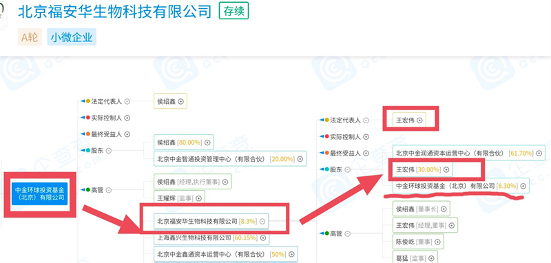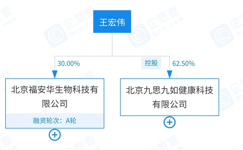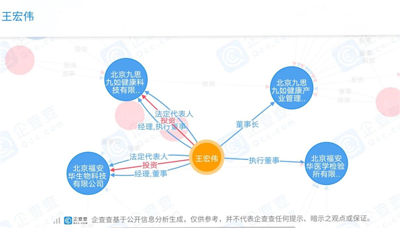 調(diào)查者從代理處獲悉,王某偉就是住邦生物科技的創(chuàng)始人。企查查APP顯示,王某偉與四家公司有關(guān)聯(lián),他不僅是北京九思九如健康科技有限公司董事長(zhǎng),還對(duì)外投資了北京福安華生物科技有限公司,持股30%并擔(dān)任該公司法定代表人、執(zhí)行董事兼總經(jīng)理;擔(dān)任北京九思九如健康產(chǎn)業(yè)管理有限公司董事長(zhǎng);擔(dān)任北京福安華醫(yī)學(xué)檢驗(yàn)所有限公司執(zhí)行董事。此外,王某偉還是中金環(huán)球投資基金集團(tuán)的核心成員。