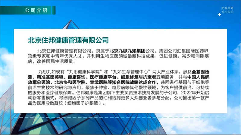 據(jù)了解,住邦生物科技的主體公司是北京住邦健康管理有限公司,北京住邦健康管理有限公司又隸屬于北京九思九如集團(tuán)。代理介紹到,集團(tuán)擁有強(qiáng)大的專(zhuān)家研發(fā)團(tuán)隊(duì),涉及全基因檢測(cè)、精準(zhǔn)基因美容、健康咨詢(xún)、醫(yī)療健康平臺(tái)、細(xì)胞修復(fù)與抗衰老五項(xiàng)服務(wù),中國(guó)人民某總醫(yī)院、北京某醫(yī)學(xué)院、宣武醫(yī)院等知名醫(yī)院都是其戰(zhàn)略合作伙伴。