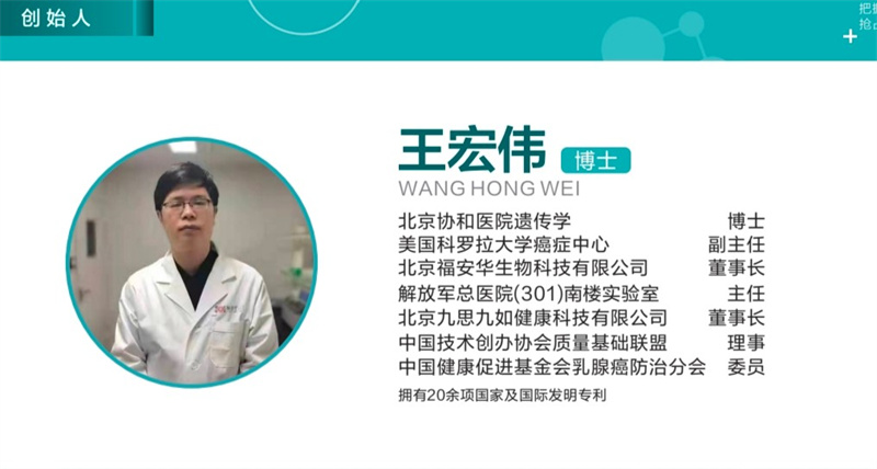 據(jù)代理宣傳,王某偉身上具有多重光環(huán)。他不僅是北京某醫(yī)院遺傳學(xué)博士,還是美國(guó)科羅拉大學(xué)癌癥中心副主任、某總醫(yī)院(301)南樓實(shí)驗(yàn)室主任、中國(guó)技術(shù)創(chuàng)辦協(xié)會(huì)質(zhì)量基礎(chǔ)聯(lián)盟理事、中國(guó)健康促進(jìn)基金會(huì)乳腺癌防治分會(huì)委員,擁有20余項(xiàng)國(guó)家及國(guó)際發(fā)明專(zhuān)利。