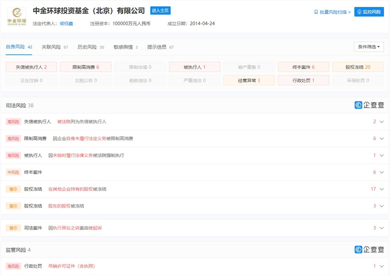 值得注意的是,中金環(huán)球投資基金集團(tuán)的主公司中金環(huán)球投資基金(北京)有限公司曾因執(zhí)行異議之訴案由被起訴3次;因未按時(shí)履行法律義務(wù)被法院強(qiáng)制執(zhí)行1次;因企業(yè)自身未履行法定義務(wù)被限制高消費(fèi)6次;因違反《中華人民共和國(guó)公司登記管理?xiàng)l例》(2016)第六十七條被行政處罰,吊銷(xiāo)執(zhí)照(登記證);涉及6起終本案件,被法院列為了失信被執(zhí)行人,凍結(jié)股東股權(quán)盒其他企業(yè)持有股權(quán)(其中就包含北京福安華生物科技有限公司)。