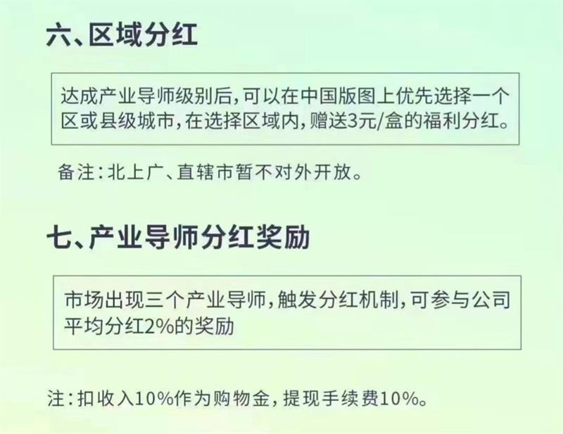 區(qū)域分紅獎(jiǎng)勵(lì):達(dá)成產(chǎn)業(yè)導(dǎo)師級(jí)別后,可以在中國(guó)版圖上優(yōu)先選擇一個(gè)區(qū)或縣級(jí)城市(除北上廣、直轄市以外),在選擇區(qū)域內(nèi),每銷(xiāo)售一盒產(chǎn)品,都可以獲得3元/盒的福利分紅。