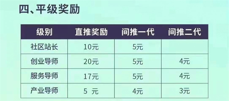社區(qū)站長(zhǎng): 自購(gòu)3盒產(chǎn)品或團(tuán)隊(duì)累計(jì)購(gòu)買(mǎi)20盒產(chǎn)品即可晉升為社區(qū)站長(zhǎng)。社區(qū)站長(zhǎng)享受359/盒的復(fù)購(gòu)價(jià)格,銷(xiāo)售一盒產(chǎn)品可獲得499-359=140元銷(xiāo)售獎(jiǎng)勵(lì);社區(qū)站長(zhǎng)團(tuán)隊(duì)下的會(huì)員每賣(mài)出一盒產(chǎn)品就可以獲得40元的極差獎(jiǎng)勵(lì);當(dāng)團(tuán)隊(duì)中有人達(dá)到同級(jí)時(shí),如果是直接推薦的好友,則可獲得其團(tuán)隊(duì)銷(xiāo)售數(shù)量10元/盒的平級(jí)獎(jiǎng)勵(lì),如果是一代的間接推廣的好友,則可獲得其團(tuán)隊(duì)銷(xiāo)售數(shù)量5元/盒的平級(jí)獎(jiǎng)勵(lì)。