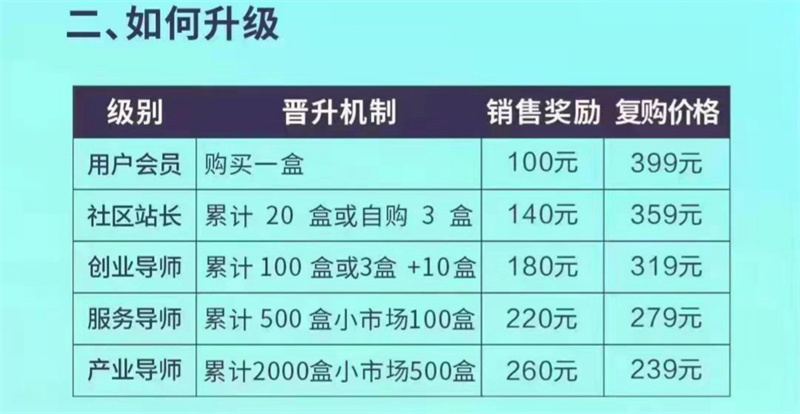用戶(hù)會(huì)員: 購(gòu)買(mǎi)一盒產(chǎn)品即可晉升為用戶(hù)會(huì)員。用戶(hù)會(huì)員享受399/盒的復(fù)購(gòu)價(jià)格,銷(xiāo)售一盒產(chǎn)品可獲得499-399=100元銷(xiāo)售獎(jiǎng)勵(lì)。
