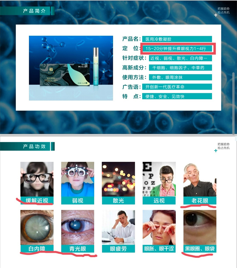 據(jù)代理介紹,“御京盛·醫(yī)用冷敷凝膠”含有密蒙花、谷精草、決明子、野菊花、蒲公英、人工牛黃、薄荷腦、冰片八大核心成分,運(yùn)用干細(xì)胞恒溫存貯技術(shù),中草藥和細(xì)胞因子共同作用,改善、抗衰。產(chǎn)品頭部采用滾珠設(shè)計(jì),只需要打開(kāi)蓋子,順著眼眶周?chē)磕ǎ缓箝]眼休息15分鐘,就可以提升裸眼視力1-4行,緩解眼脹、眼干澀,有效治療近視、弱視、散光等病癥,去除黑眼圈、眼部細(xì)紋、改善青光眼、白內(nèi)障、老花眼、飛紋眼等眼疾。但該產(chǎn)品的效果真的有其所宣傳的那么神奇嗎?