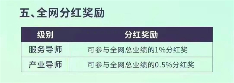 產(chǎn)業(yè)導(dǎo)師分紅獎(jiǎng)勵(lì):達(dá)成產(chǎn)業(yè)導(dǎo)師級(jí)別后,團(tuán)隊(duì)中出現(xiàn)三個(gè)產(chǎn)業(yè)導(dǎo)師,就可觸發(fā)分紅機(jī)制,可參與公司總業(yè)績(jī)2%的平均分紅獎(jiǎng)勵(lì)。