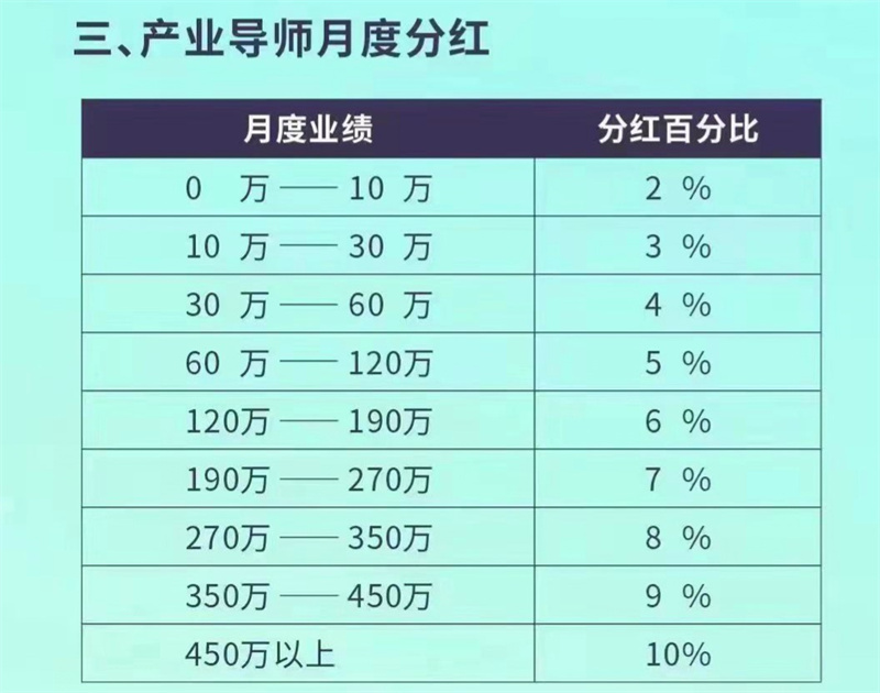 團(tuán)隊(duì)業(yè)績(jī)分紅獎(jiǎng)勵(lì):產(chǎn)業(yè)導(dǎo)師的團(tuán)隊(duì)月總業(yè)績(jī)?cè)?~10萬(wàn)之間,可獲得團(tuán)隊(duì)月總業(yè)績(jī)2%的分紅;團(tuán)隊(duì)月總業(yè)績(jī)?cè)?0~30萬(wàn)之間,可獲得團(tuán)隊(duì)月總業(yè)績(jī)3%的分紅;團(tuán)隊(duì)月總業(yè)績(jī)?cè)?0~60萬(wàn)之間,可獲得團(tuán)隊(duì)月總業(yè)績(jī)4%的分紅;團(tuán)隊(duì)月總業(yè)績(jī)?cè)?0~120萬(wàn)之間,可獲得團(tuán)隊(duì)月總業(yè)績(jī)5%的分紅;團(tuán)隊(duì)月總業(yè)績(jī)?cè)?20~190萬(wàn)之間,可獲得團(tuán)隊(duì)月總業(yè)績(jī)6%的分紅;團(tuán)隊(duì)月總業(yè)績(jī)?cè)?90~270萬(wàn)之間,可獲得團(tuán)隊(duì)月總業(yè)績(jī)7%的分紅;團(tuán)隊(duì)月總業(yè)績(jī)?cè)?70~350萬(wàn)之間,可獲得團(tuán)隊(duì)月總業(yè)績(jī)8%的分紅;團(tuán)隊(duì)月總業(yè)績(jī)?cè)?50~450萬(wàn)之間,可獲得團(tuán)隊(duì)月總業(yè)績(jī)9%的分紅;團(tuán)隊(duì)月總業(yè)績(jī)超過(guò)450萬(wàn),可獲得團(tuán)隊(duì)月總業(yè)績(jī)10%的分紅。