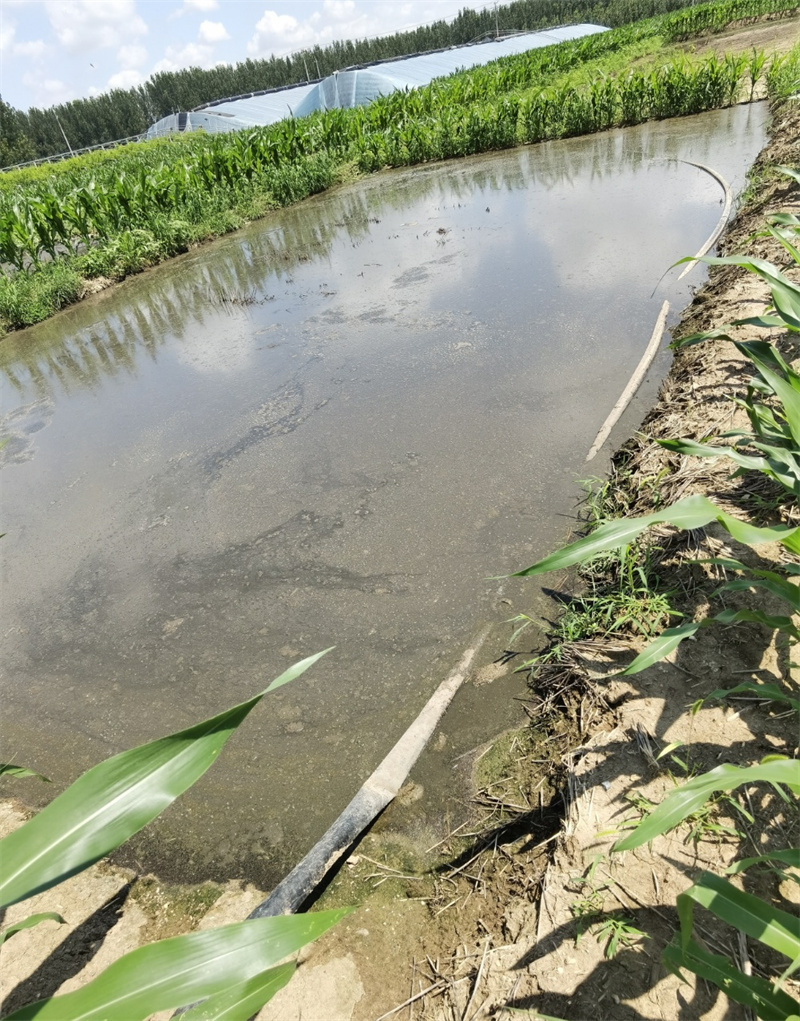 調(diào)查員7日到亓家莊村實(shí)地調(diào)查,在村民指引下來(lái)到養(yǎng)鴨場(chǎng),這個(gè)養(yǎng)鴨場(chǎng)占地20多畝左右,有六個(gè)大型養(yǎng)殖棚。在養(yǎng)鴨場(chǎng)東側(cè)的農(nóng)田里,靠近就聞到陣陣臭味,地壟上長(zhǎng)著雜草,地里黑臭寸草不生,沉積著鴨毛等垃圾,踩上去很軟,村民說(shuō)這是糞水淹過(guò)后曬的。沿地壟向東走,看到還沒(méi)滲下去的黑臭糞水。再向南還有幾個(gè)大坑,滿滿的黑臭糞水,從養(yǎng)鴨場(chǎng)伸出的一根粗塑料管子通向大坑,坑邊種著部分玉米,從遠(yuǎn)處看大坑被玉米擋得很嚴(yán)實(shí),但陣陣臭味還是出賣了它們的存在。排放糞水的農(nóng)田大約在十幾畝地左右,村民說(shuō)這地就白白浪費(fèi)了,種上糧食多好。