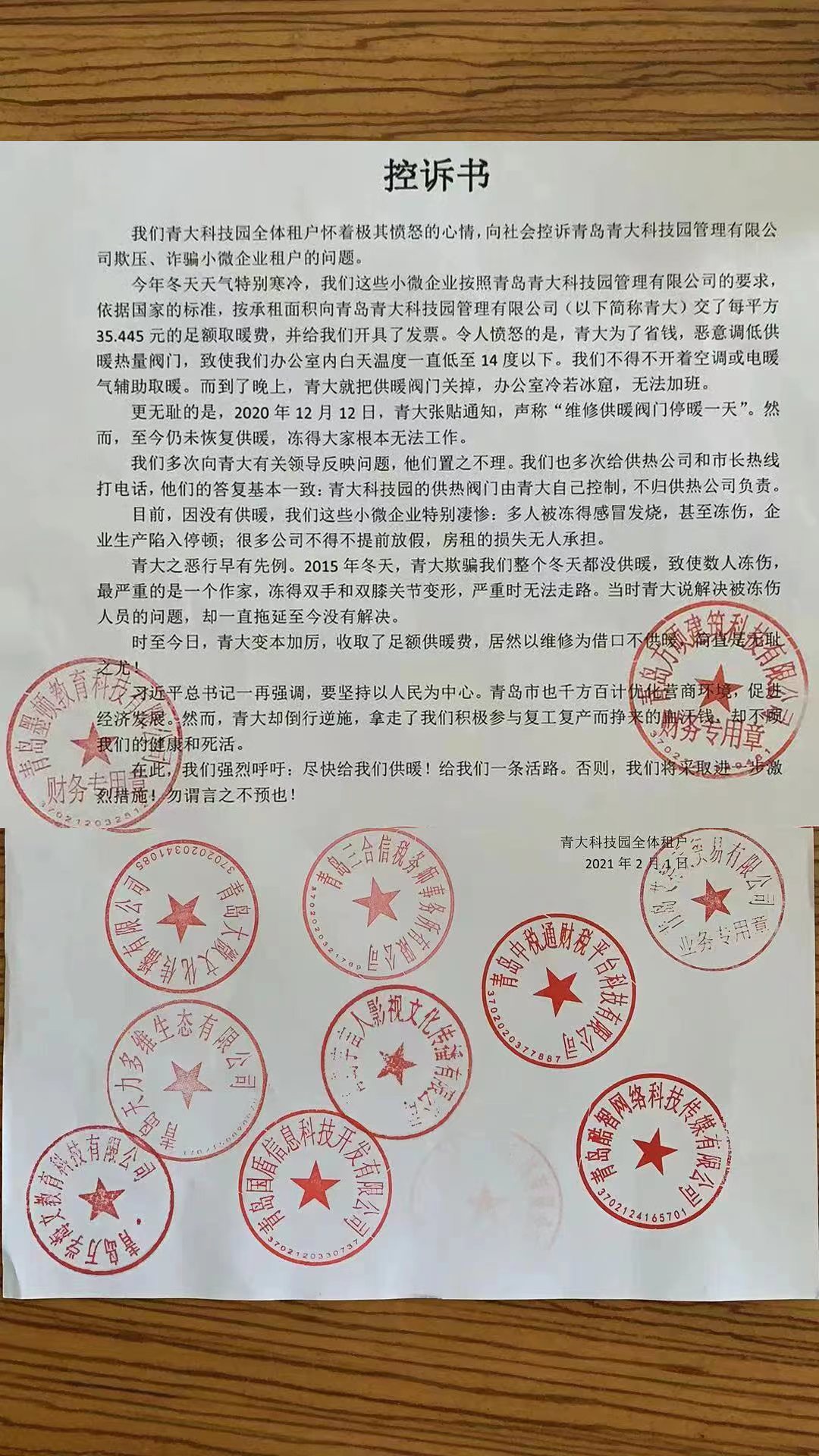 青大不接受凍傷人的教訓(xùn),歷年冬天收費(fèi)不供暖,今冬照舊,使各小微企業(yè)無(wú)法過(guò)冬,違背中央以人為本的精神。大學(xué)本是教書育人弘揚(yáng)社會(huì)主義精神文明之地,卻長(zhǎng)期干著以大欺小以強(qiáng)欺弱的奸商勾當(dāng),制造社會(huì)不安定因素。呼吁各媒體和全社會(huì)為我司及遭受迫害無(wú)法過(guò)冬的各小微企業(yè)弱勢(shì)群體伸張正義,討回公道。