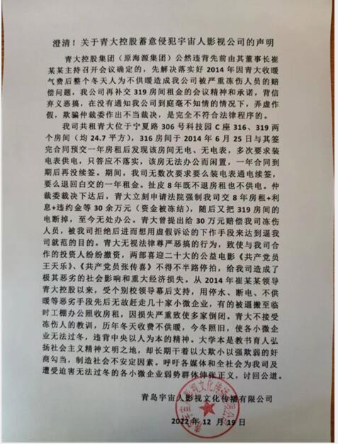 從2014年崔某某領(lǐng)導(dǎo)青大控股以來(lái),受個(gè)別校領(lǐng)導(dǎo)幕后支持,用停水、斷電、不供暖等惡劣手段先后無(wú)故趕走幾十家小微企業(yè),有的被逼搬至臨時(shí)工棚辦公照收房租,因損失嚴(yán)重致使多家倒閉。