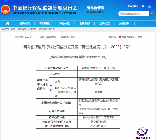 因違規(guī)收取保險(xiǎn)代理合同約定之外的手續(xù)費(fèi),青島銀保監(jiān)局對(duì)青島誠(chéng)信達(dá)保險(xiǎn)代理有限公司即墨分公司及其法定代表人聶麗娟給予警告并罰款。