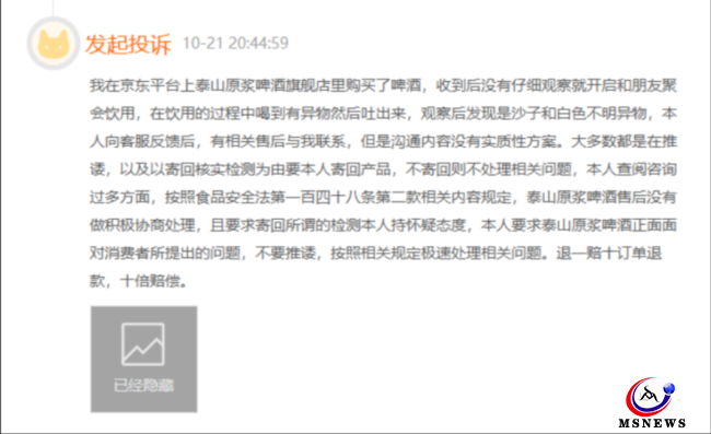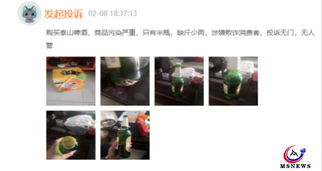 一位消費者2月8日投訴稱,購買泰山啤酒,商品污染嚴(yán)重,只有半瓶,缺斤少兩,涉嫌欺詐消費者,投訴無門,無人管。其后該消費者補充了3次投訴信息,截至目前,該投訴僅停留在3月21日的泰山原漿啤酒回復(fù),該條投訴仍在繼續(xù)。