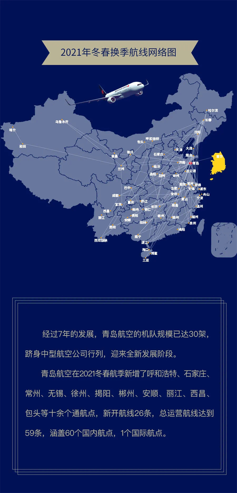 經(jīng)過7年的發(fā)展,青島航空的機(jī)隊(duì)規(guī)模已達(dá)30架,躋身中型航空公司行列,迎來全新發(fā)展階段。青島航空在2021冬春航季新增了呼和浩特、石家莊、常州、無錫、徐州、揭陽、郴州、安順、麗江、西昌、包頭等十余個(gè)通航點(diǎn),新開航線26條,總運(yùn)營航線達(dá)到59條,涵蓋60個(gè)國內(nèi)航點(diǎn),1個(gè)國際航點(diǎn)。