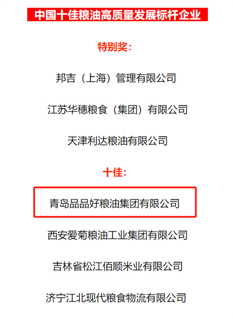 榮譽既是一份鼓勵,也是激勵。未來,青島品品好糧油集團將繼續(xù)積極開拓創(chuàng)新,努力加快建設成為產(chǎn)品卓越、品牌卓著、治理現(xiàn)代的糧油企業(yè)。(李雷)